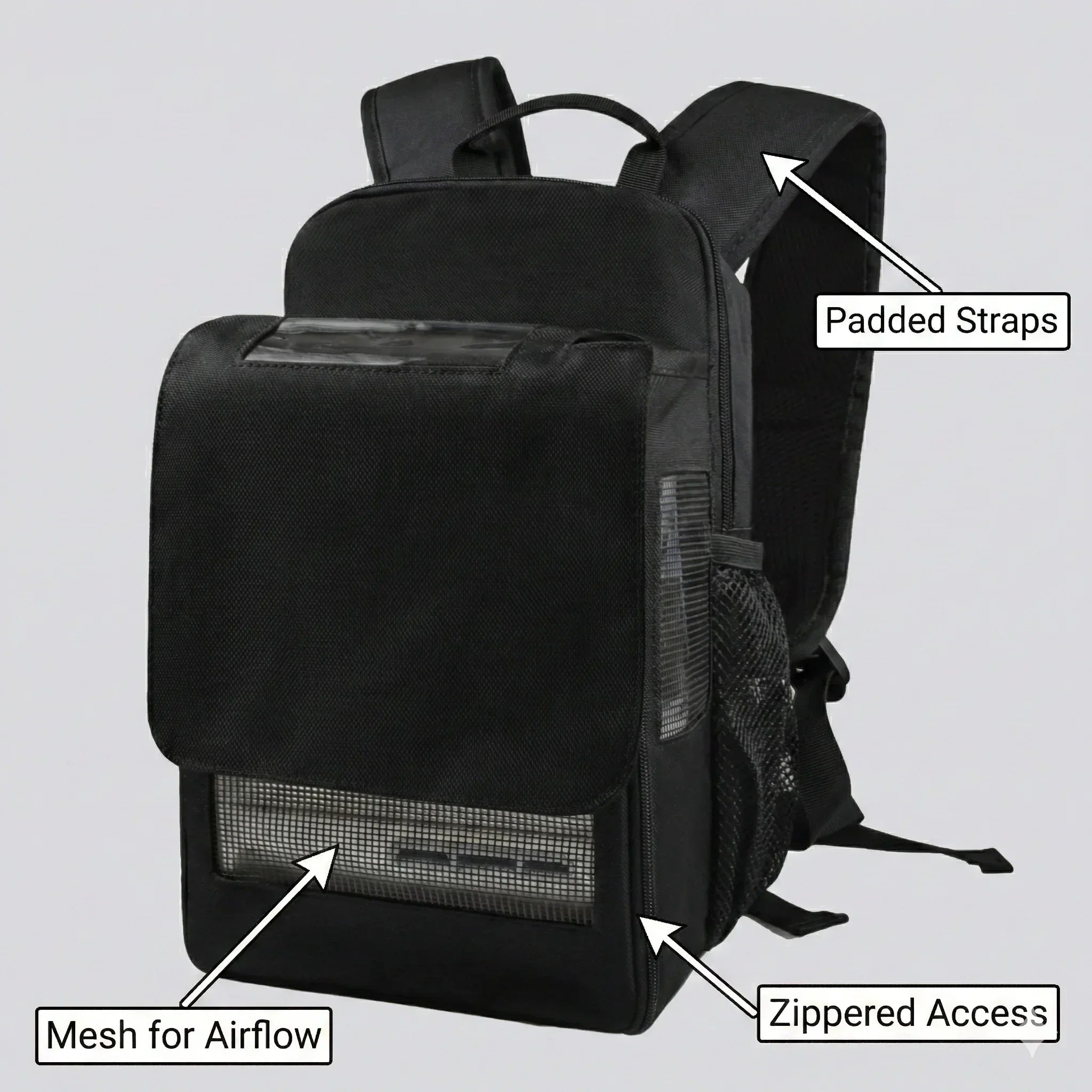 Designed for Comfort: Oxygen units and extra batteries can get heavy.1 We utilize triple-padded ergonomic shoulder straps (with a cannula holder) and an adjustable waist belt. The waist belt is a game-changer—it transfers weight from your shoulders to your hips, reducing back strain and allowing you to walk longer distances with ease.