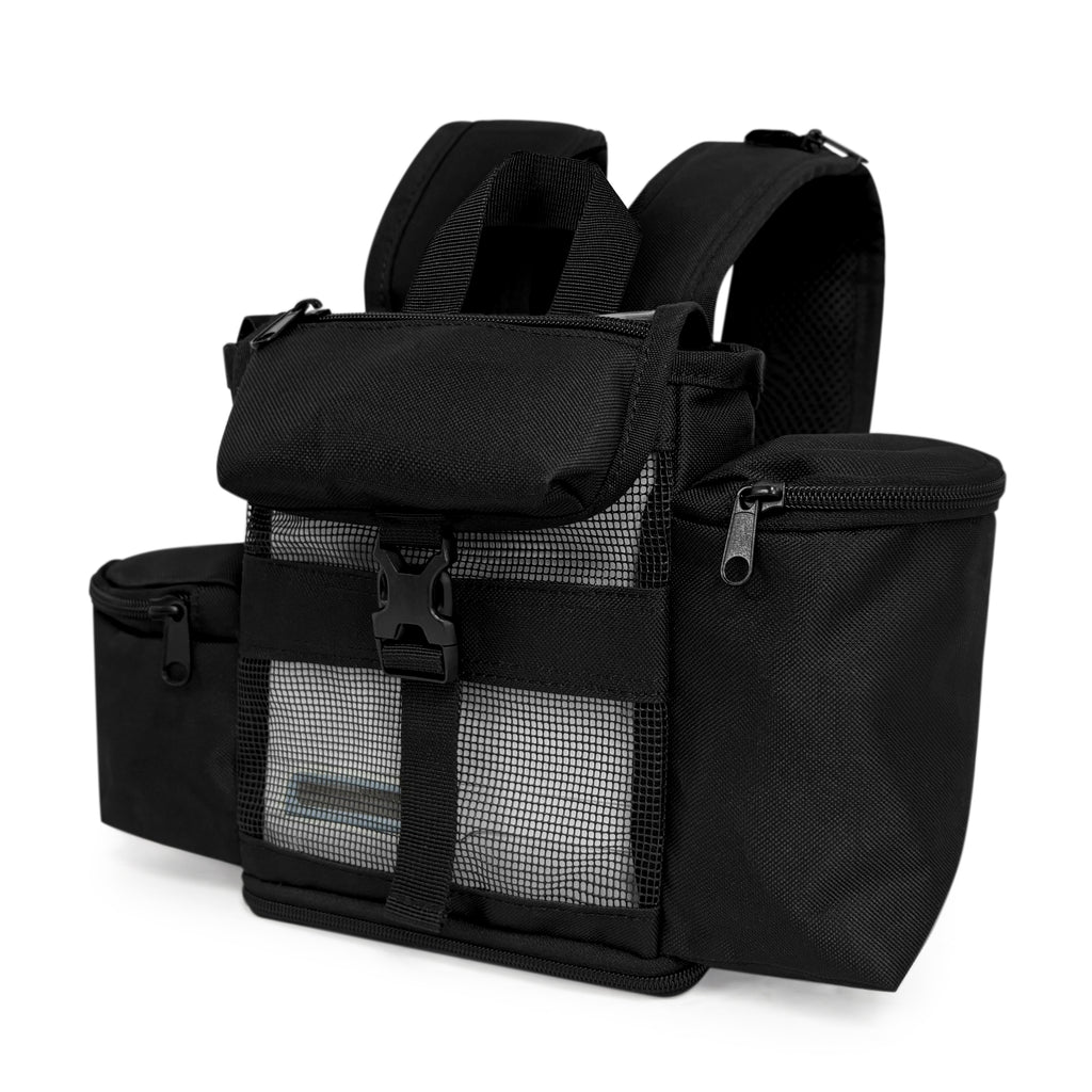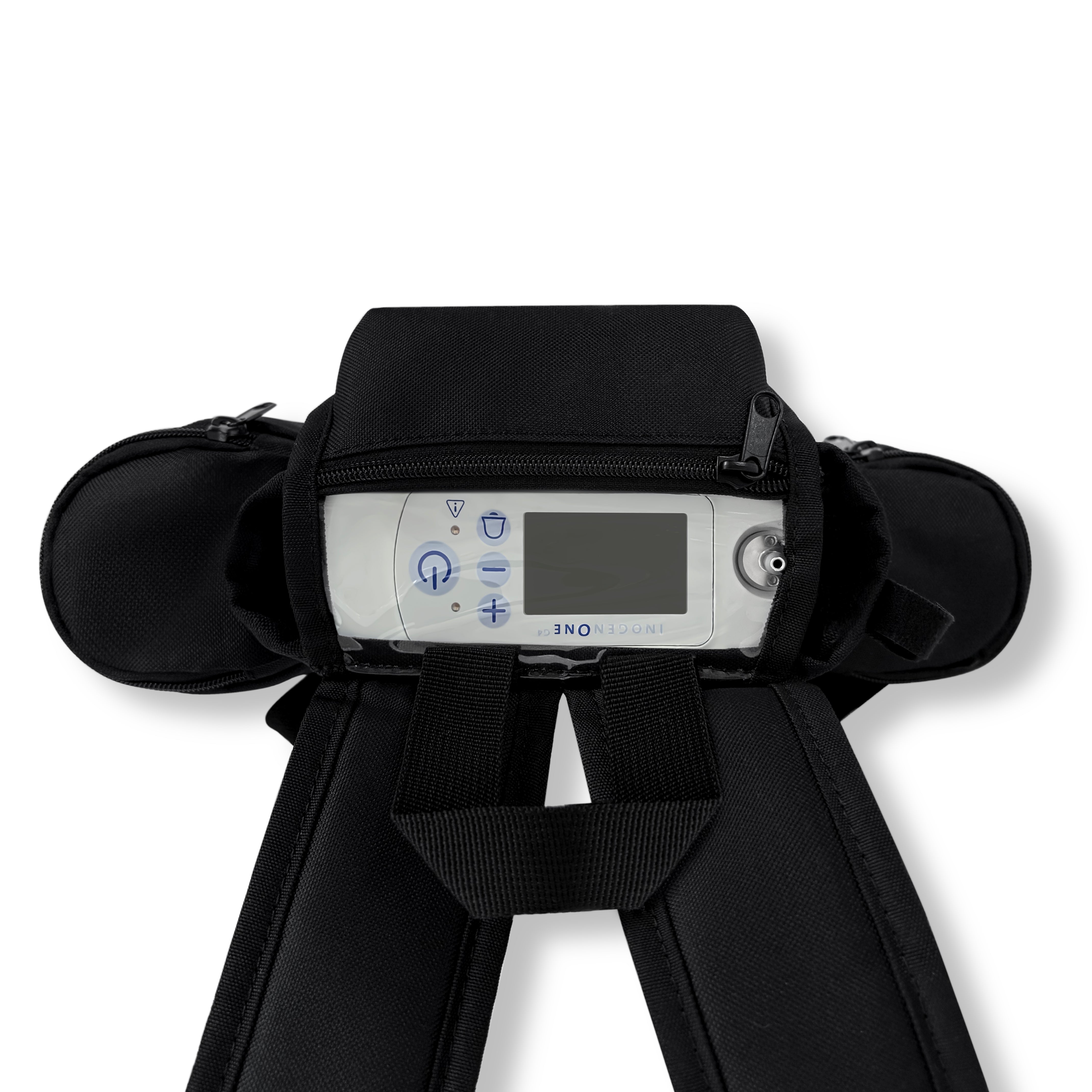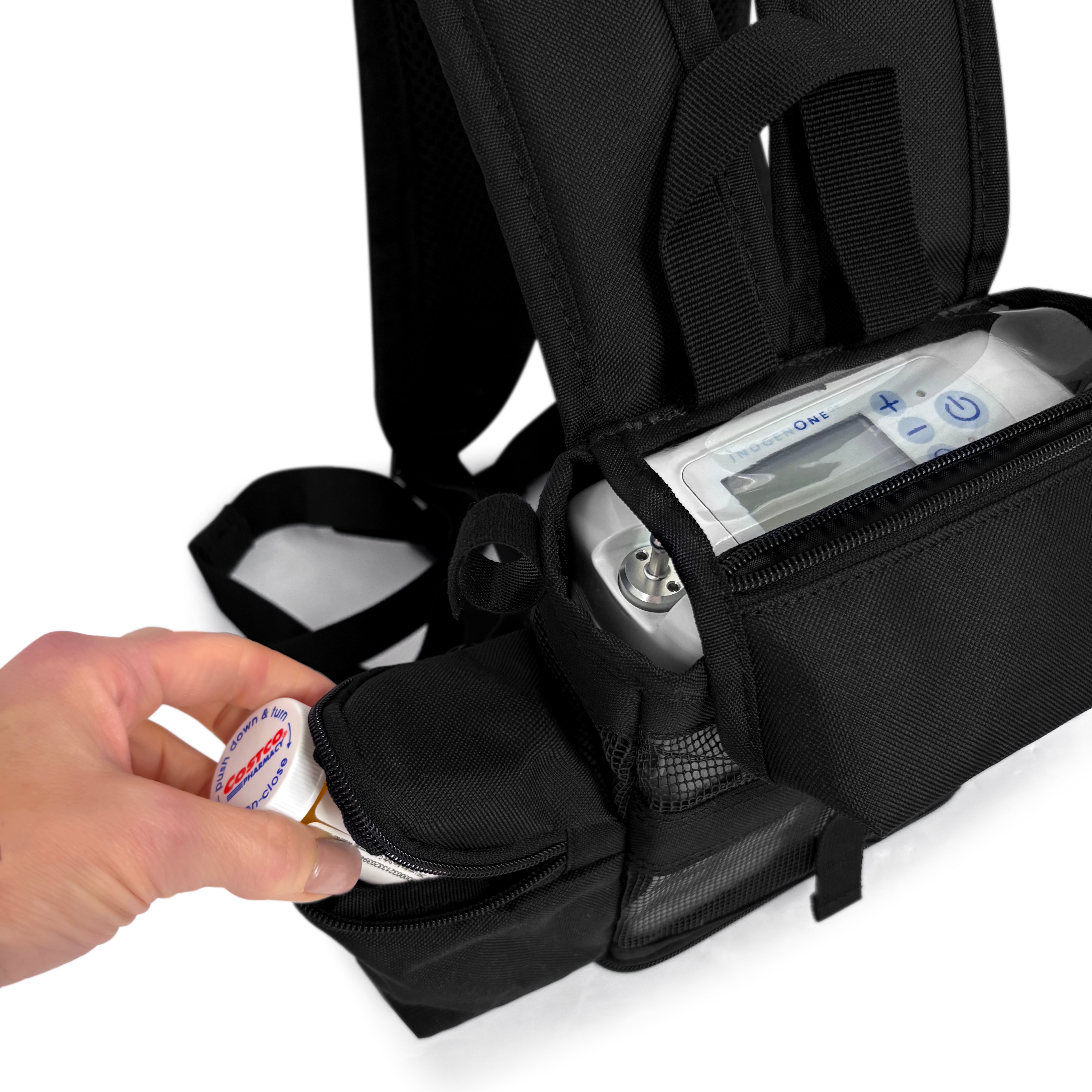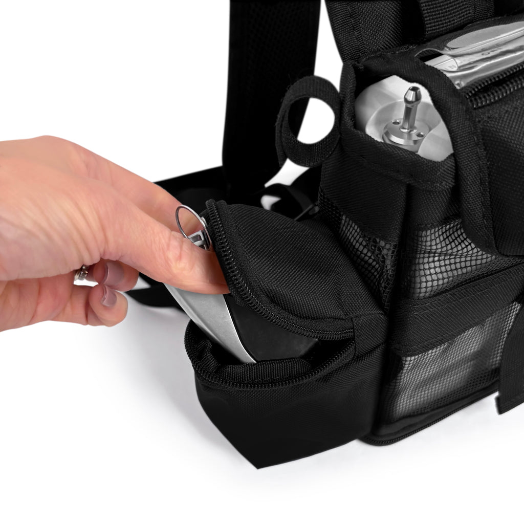 Designed specifically for Oxygo Fit POC, this backpack delivers hands-free portability without the burden. The lightweight 600D cordura construction weighs just 13 ounces, making it an ideal companion for daily mobility. A removable battery compartment accommodates both standard and double batteries, while dual side pockets provide convenient storage for extra power cells, keys, wallet, or charging accessories. Mesh front and back panels ensure proper ventilation for your device. Fully padded, adjustable straps (25"-45") adapt to most users, and durable silver-toned hardware withstands regular use. The drawstring side design secures contents during transport, while the carry handle offers versatile handling options. Easy to maintain and built to last.