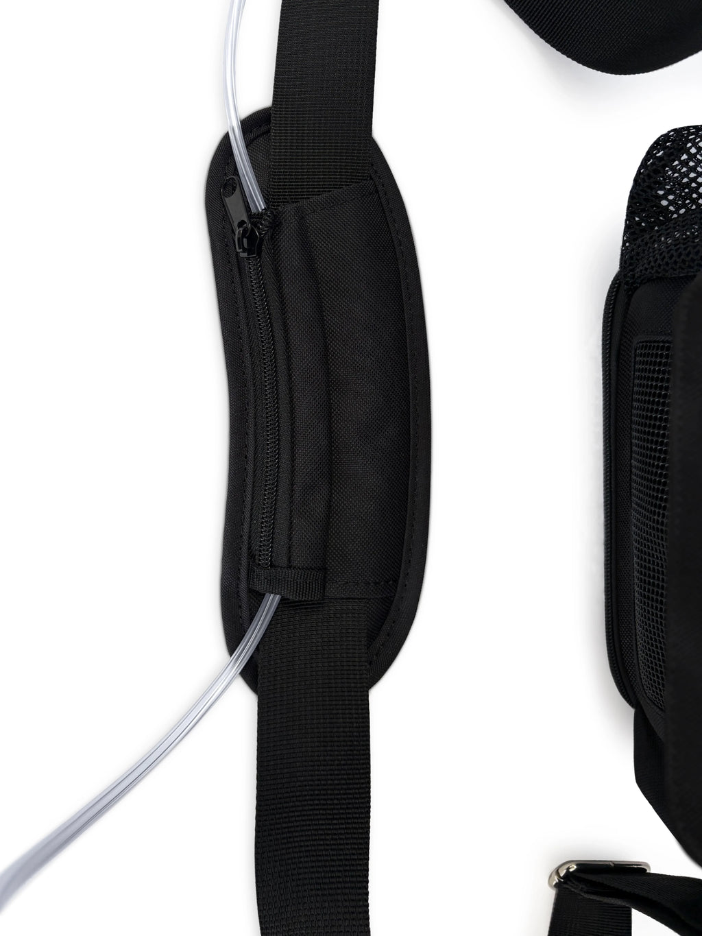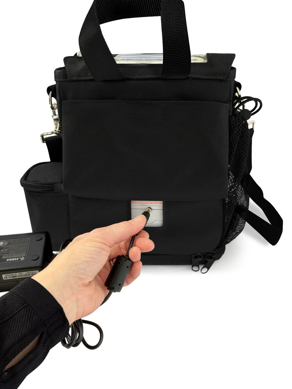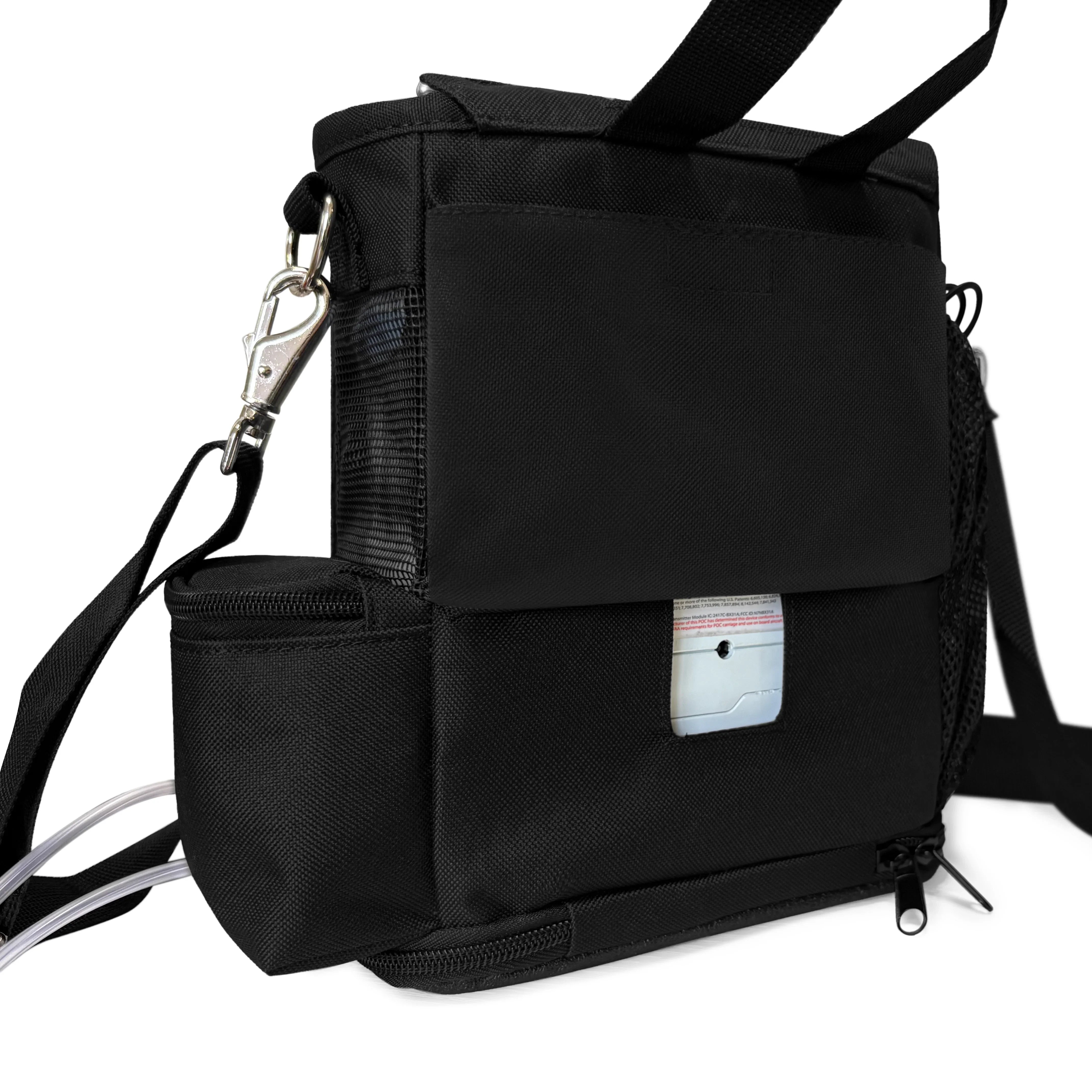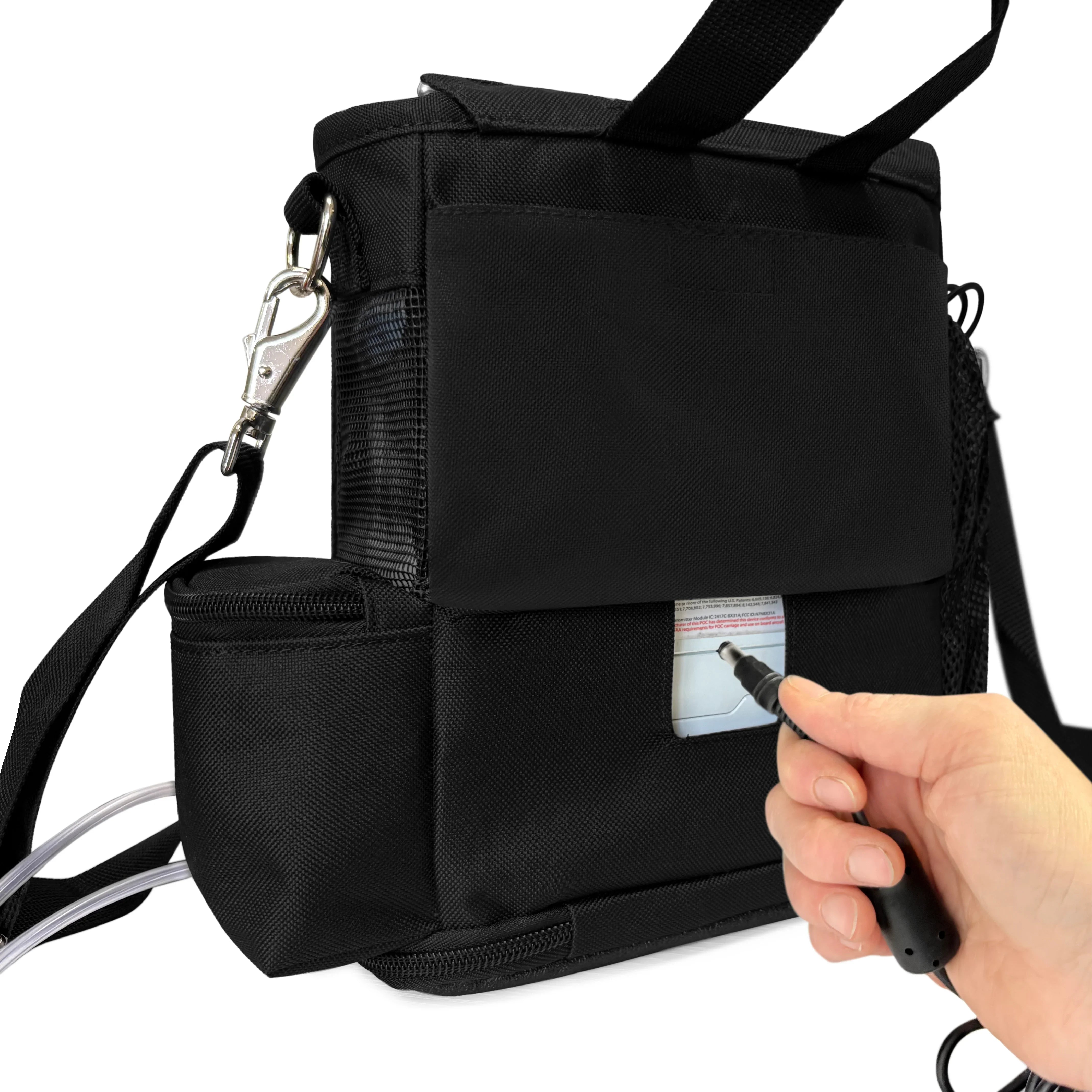 Worried about your cannula? Your cannula is safe with the zipper compartment on the carry strap that attaches your cannula to keep it safe from dragging. Charge your unit in the carry bag with the open access to your charging port, plus, extra pockets, mesh panels, adjustable strap with padded shoulder, and zippered bottom to easily take battery on and off. Perfect for anyone in the house or out!